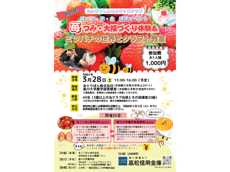 2026年3月28日(土)たかまつしんきんキッズクラブ 産・官・学・金連携イベント 苺つみ・大福づくり体験&ミツバチの世界とクラフト教室【香川県木田郡三木町】
