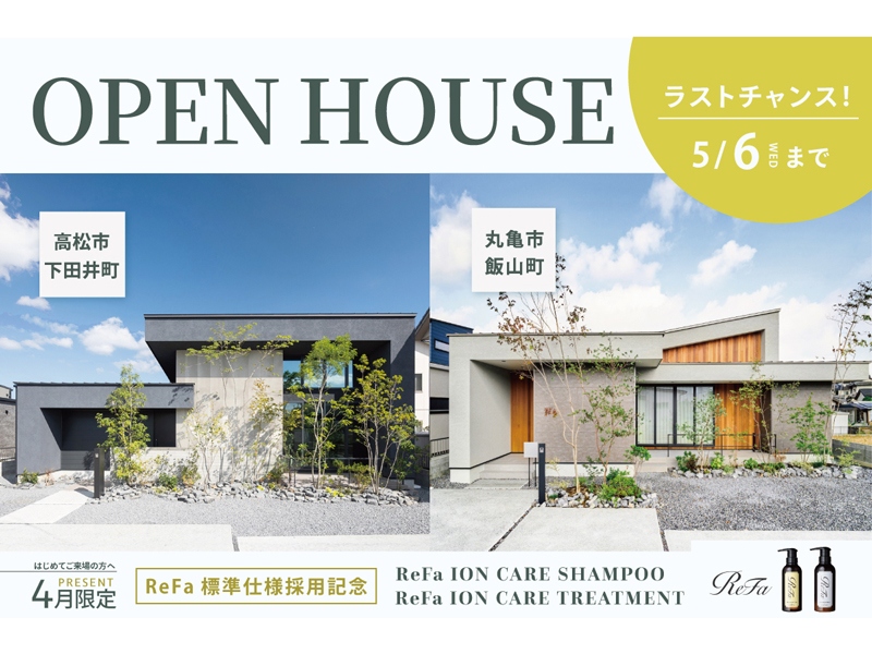開催中 2026年4月1日(水)~ 5月6日(水)【5月6日まで】高松・丸亀 2つの平屋モデルハウス見学会|予約受付中【香川県高松市下田井町・丸亀市飯山町】
