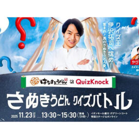 讃岐うどんの魅力や奥深い文化をクイズ大会やトークショーを通して楽しく学ぶことを目的としたイベント「さぬきうどん クイズバトル」を『イオンモール綾川』にて開催!当日は、東大卒のクイズ王・伊沢拓司さんと、讃岐うどんYouTuber・ヤグタウンさんの2人をゲストに迎えてお届けするトークショーをはじめ、リアルイベント会場の参加者130名とオンライン参加者1,850名の約2,000名が、はなまるうどんや讃岐うどんに関するクイズに挑戦!クイズ大会後、参加者には「はなまるうどん」で利用できる「お好きなうどん100円引き」のお得なクーポンが配布される。さらに、リアルイベント会場で戦った成績上位3名は、決勝戦の舞台に上がるチャンスを獲得でき、伊沢さん&ヤグタウンさんチームと早押しクイズで勝負。見事勝利した方には、「はなまるうどん」で利用できる「天ぷら1年分無料券」をプレゼント!