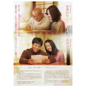 読み書きできない夫と幸せを教えてくれた妻が歩んだ人生を描く感動の実話を『ユープラザうたづ』で上映!貧しい家庭に生まれ、ほとんど学校に通えなかった夫が、35年間支え合い、共に生きてきた最愛の妻へ感謝の想いを込めてラブレターを綴る。そんな心温まる感動ストーリーをお見逃しなく。チケットは、『ユープラザうたづ』の事務所にて、好評発売中!さらに、上映会当日にチラシを持参された方は、チラシ1枚につき5名まで前売料金での入場が可能なのでお得に映画を楽しんで。