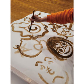 「1つの素材を遊び尽くす」をテーマに、泥を素材とした遊びを楽しむシリーズイベント第5弾。これまで、土で泥だんごを作ったり、水を加えてどろんこ遊びをしたりと、泥を使った様々な楽しみ方を体験してきた。今回は、泥を絵の具にしてお絵描きに挑戦!“泥”1つから広がる、多彩な遊びを楽しんで。