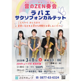 終了しました。 2026年3月8日(日)音のZEN奏会 ラパエサクソフォンカルテット【香川県善通寺市文京町】