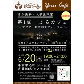 ”地元企業と大学生を繋げるカフェ”としてオープンした『With Cafe』にて、アフター地域創生フォーラムとして「第1回よるカフェ」を開催!公務員と大学生がフラットに語り合う場として、四国財務局、香川県、高松市、高松市教育委員会、観音寺市、土庄町などの輝く公務員が参加。これからの地域創生のあり方について、思い思いの意見を交換できるイベントとなる予定だ。参加は現役大学生限定、参加費は無料!事前申込制なので、気になる方は「With Cafe」までお問い合わせを。