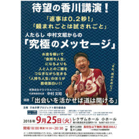 有限会社クロフネカンパニーの代表取締役社長である 中村文昭氏による講演会。「返事は0.2秒」、「頼まれごとは試されごと」など、心に響く名言が続出!自身の経験を活かした情熱的な講演は必聴!“金持ち人生”ならぬ、人と人とのご縁を繋ぎながら生きる“人持ち人生”の面白さに触れてみて。