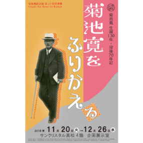 明治21年に生まれ、19才で上京するまでを高松で過ごした菊池寛。「父帰る」や「恩讐の彼方に」、「真珠夫人」などの不朽の名作を生み出した寛は、ヒューマニズム、リアリズムの作家として後世の作家たちに多大な影響を与えた。また、文筆活動の他に雑誌・文藝春秋の創刊や芥川賞・直木賞の創設など、現在に至るまでの文壇の隆盛の礎を築き、著作権の擁護や作家の地位向上など、数々の功績を残している。本展では、そんな菊池寛の生誕130年・没後70年を記念し、菊池家の協力の下で初公開となる菊池家所蔵の古文書や直筆原稿、愛用品、写真などの数々の貴重な資料を公開。多彩な交友関係やエピソードと共に郷土が誇る文化人・菊池寛の実像に迫る。作品朗読会や講演会など、関連行事も予定しているので詳しくはHPをcheckして。