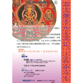 明治初期に高野山金剛峰寺より秘仏、弘法大師空海座像が伝承し、名刹 無量寿院の境内地に高野山出張所 本尊として御勧請。その後、この尊像を本尊に迎えて『高野山讃岐別院』が大正8年に建立してから100年となることを記念した展覧会。曼荼羅の他、100年の歩みを写真で見ることができる。写経やお守り作りのワークショップも実施。期間中は要予約で「薬膳カムカムランチ(2,000円)」もご用意。