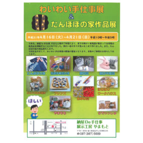 終了しました。開催中~4月21日(日)真心を込めて作った作品 約1,000点の展示販売を開催中!!『わいわい手仕事展&たんぽぽの家作品展』