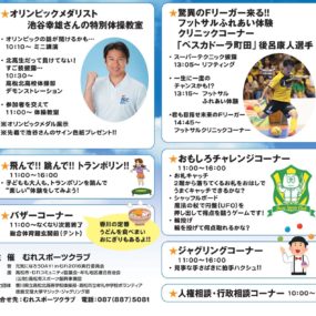 今年の「元気になろうDAY!」は、むれスポーツクラブ設立10周年を迎えた記念イベントとして、オリンピックメダリストの池谷幸雄氏をゲストに迎え、ミニ講演会や特別体操教室、オリンピックのメダルの展示などが行われる。合わせて、地元、高松北高校男子体操部のデモンストレーションも開催。さらに午後からは、東京町田市をホームタウンとするフットサルクラブチーム「ペスカドーラ町田」から現役Fリーガー後呂康人選手のフットサルクリニックも開催!トランポリンコーナーやおもしろチャレンジコーナーなど、楽しいコーナーも盛りだくさん!