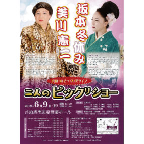 美川憲一のものまねで本人とも共演経験のある美川憲二と、坂本冬美のものまねで全国各地のイベントに引っ張りだこの坂本冬休みが2人でショーを開催。歌声はもちろん、見た目や仕草も本人にそっくりできっと驚くはず。笑いと感動が溢れるひと時を過ごそう。
