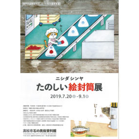 香川県出身のイラストレーター・ニシダシンヤ氏の作品展。切手の図柄を活かして封筒の宛名面に絵を描いた絵封筒を中心に、四国新聞社のウェブサイトにて連載している週刊4コマ漫画「かまタマくん」の原画や画材、制作風景の映像などを展示。7月28日(日)には先着20名限定のワークショップ、8月4日(日)にはニシダシンヤ氏によるトークショーを開催。