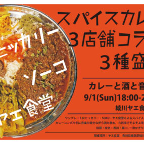 のどかな田園風景が広がる『ヤエ食堂』に観音寺市にある複合施設『SŌKO』のカレーと高松市にあるスパイスカレー専門店『ヒッカリー』のカレーが集結!ワンプレートに3店舗のカレーを盛り付け、この日だけのスペシャルなカレーを提供。静寂に包まれる晩夏の夜、音楽に耳を傾けながら美味しいカレーとお酒を愉しもう!