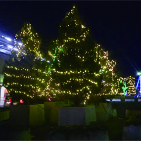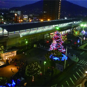 JR坂出駅北口にある高さ16mのヒラヤマスギをメインに、色鮮やかなイルミネーションが駅前広場を彩る「2019さかいで光輝里フェスティバル」。坂出の冬景色を華やかに魅せるイルミネーションをぜひ楽しんで。