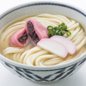 「さぬきの夢」を100%使用したうどんの上に、紅いあん餅をのせたうどん。
