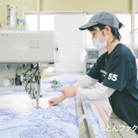 1966年に創業した四国繊維販売株式会社の寝具ブランド。生地とワタからふとんが完成するまでを見学することができる。