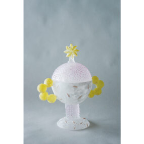 安達知江氏はアメリカのマイケルロジャース氏の制作補佐を経て、岡山のグラススタジオ『透明館』に勤務後 2015年独立。作品は石膏の型を作って窯で焼くキルンワークで施され、絵付けは色鉛筆と薄く滲んだ水彩絵のような優しい色目が特徴。絵本の中から抜け出してきたような作品は唯一無二。