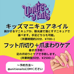 - 入場無料、ヨガ体験(オープン記念価格・2,500円〜)、キッズネイル(700円〜)、フット爪切り+爪まわりケア(2,500円〜)