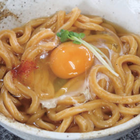 赤釜玉、名物麺「赤さぬき」はマイルドな辛さがクセになる逸品。