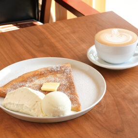 外はカリカリ、中はモチモチの生地にバターとシュガーを重ねた定番の一皿。