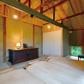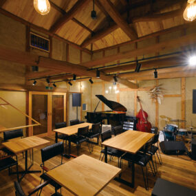 ジャズサックス奏者の國井氏がOPENした、訪れる人が思い思いに利用できる複合施設。カフェの空間では、國井夫妻こだわりの食事やスイーツ、ドリンクやお酒を提供。2階は、コワーキング利用 もOK!その他、五右衛門風呂付きの宿泊部屋は、1日1組(最大4名様)限定。自然に囲まれた穏やかな土地に佇む、築75年の納屋を心地良く改装した空間で好きなことに没頭するひと時を過ごして。