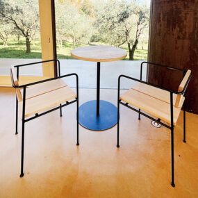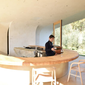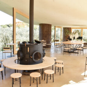 オリーブ畑の景観を活かした全天候型の空間が誕生。ガラス張りの建物は、自然との調和をテーマにし、床を土の色に合わせたり 鉄×木材など、自然を掛け合わせているのがポイント。屋根まで続く、鉄でできた円柱状の柱は、中に土が入っているので、将来的にはオリーブが植栽される予定。カフェでは、オリジナルドリンクや『菓子工房ルーヴ』と協同開発したスイーツプレートなどを提供予定。ウエディングや貸切営業、ライブなどのイベント利用も大歓迎!