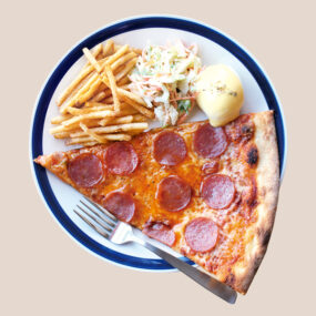 お好きなピザ1slice(2slice+350円)、ウフマヨ、フライドポテト、コールスロー、セットドリンク付