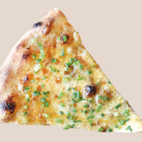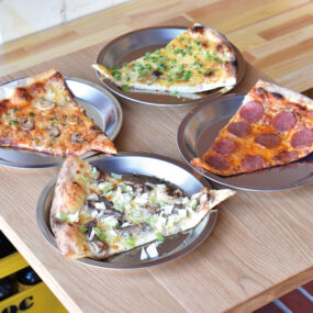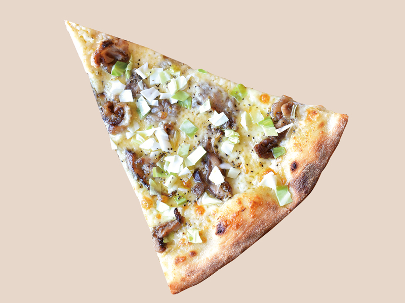 直径50cmのピザを8等分にしたものを提供。定番「ペパロニピザ」をはじめ、名物・骨付鳥をイメージした「丸亀スパイシーチキンピザ」や「釜玉ピザ」など、香川丸亀の魅力を伝えられるメニューを展開。