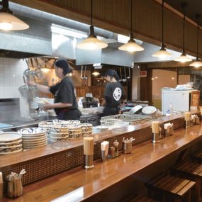 学生やサラリーマンのお客さんでにぎわう「周月」。店内で作る自家製麺は何回も生地を張り合わせ、自然とちぢれさせることで、つるつる感と透明感を追求。モチモチ食感で食べごたえも抜群な上に、並盛から特盛まで値段が変わらないのも嬉しい。