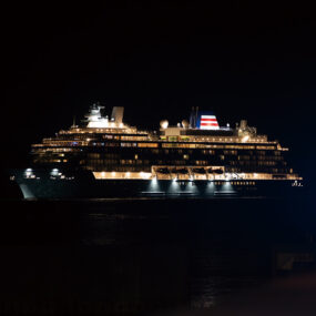 タイミングが良ければ幻想的に輝く旅客船に出合える。