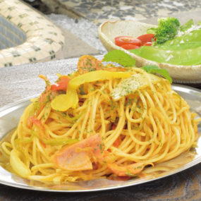 カウンター席以外に湯船が掘りごたつ席に変身した一風変わった席もご用意。イタリアンスパゲティやピラフなど昭和の喫茶をコンセプトにしたメニューが楽しめる。