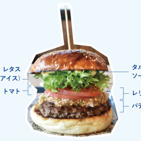 自家製天然酵母バンズで、店内仕込み牛肉100%のパティ、トマト、水耕栽培のレタスをサンド。味付けは仁尾酢で和えたオニオンマスタードレリッシュと自家製タルタルソース。