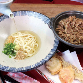 大きなどんぶりに入ったツヤツヤのうどんに、目の前でダシを注ぎ入れてくれるおもてなしスタイルが早くも話題のこちら。国産小麦を100%使用した低温二段熟成させて作る麺はモチモチとした食感が特長で、優しい味わいのダシにもピッタリ。また、うどんメニュー全品に天ぷらセットがついているのも嬉しいポイント。できたて熱々の美味しいうどんにぜひ舌鼓を打ってみて。