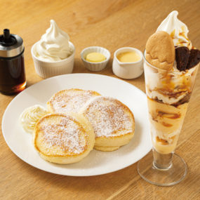 濃厚で新鮮な卵をたっぷり使ったふんわりパンケーキとプリンパフェ♡