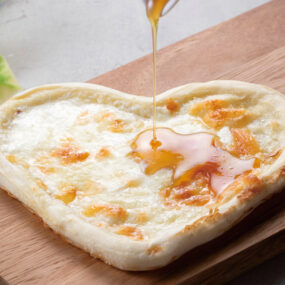 ハートを組み合わせ、幸せのクローバー型にした「クアトロアモーレピザ」♡4種のチーズがたっぷり入った「クアトロフォルマッジ」は、ハニーメープルをかけてスイーツ感覚で召し上がれ♪