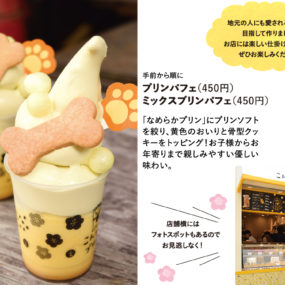 「なめらかプリン」にプリンソフトを絞り、黄色のおいりと骨型クッキーをトッピング!お子様からお年寄りまで親しみやすい優しい味わい。