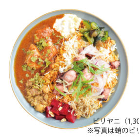 写真は蛸のビリヤニ。スパイスで炊き込んだご飯に「いりこ出汁のチキンカレー」と3・4種類のおかずが一皿に。満月の週のみ提供で具材は旬のものを使用。