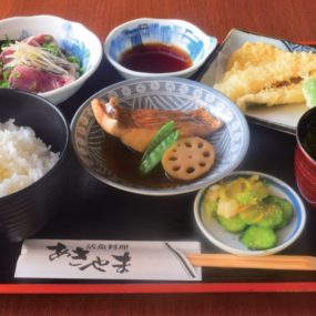新鮮でボリュームのある魚料理をリーズナブルに味わえるとサラリーマンや地元の人に人気の「あきやま」。定食の他、夜のコース料理「おまかせ7品(4,000円)」もおすすめ!ご飯はガス釜で炊いているのでふっくら美味しい。季節ごとに変わるメニューを楽しんで。