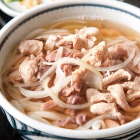 2種類の親鳥を使用した食べるほどに味わい深い肉とダシの旨味をじっくり堪能。伊吹産のイリコを使用した天然ダシと、もっちりとコシのある麺が特徴。定番人気の「かけうどん(300円)」をはじめ、かけうどんと炊込みご飯、海老天ぷらがセットの「うどん定食(580円)」などお得過ぎるセットメニューも好評。