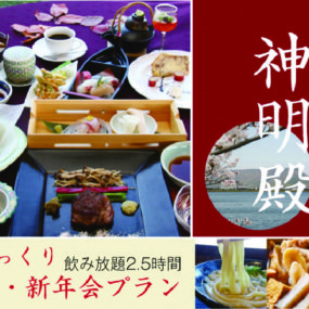 1300年の歴史が紡ぐ由緒ある石清水八幡宮にある「神明殿」から、ゆっくりと美味しいお料理が楽しめる忘・新年会、宴会プランの登場!料理を贅沢に楽しむ〔贅沢プラン〕、会費をおさえて楽しむ〔会費プラン〕しかも、飲み放題(2.5時間)付!さらに、カラオケや県内の送迎も無料サービス・・。
