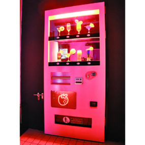 入口は自販機をモデルにしたカワイイ扉がお出迎え。気分で店主おまかせカクテルがあるらしい。ピンクの照明が特徴的な店内はK-POPが流れています。