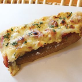 ■バケットピザ(194円)ソフトフランス系バケットがチーズとマッチ!冷めてもおいしく食べられるように考慮されたパン。