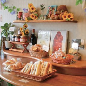 11号線沿いに目を引くキャラクターが描かれた看板のパンをもぐもぐ食べているキャラクターの姿に惹かれて、来店する人多数。定番パンからオリジナル商品まで、多種多様のパンが楽しめる!