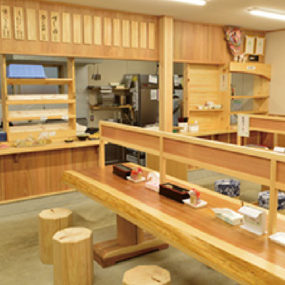 おすすめは『吉田農園』のレモンを使用した「仁尾レモンぶっかけ(小・350円)」や『丸岡味噌麹製造所』の味噌で作った「えび味噌おにぎり(100円)」。杉を使用した温かみのある店内。地元に限らず観光客も足を運ぶ。