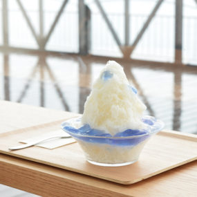 窓の外に広がる青い海と空、そして白い雲をイメージして作られたかき氷「海と空のかき氷(750円)」