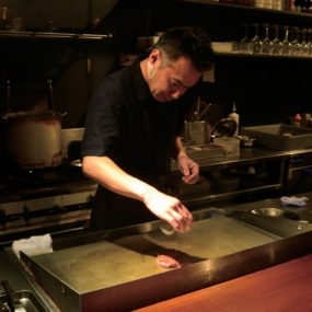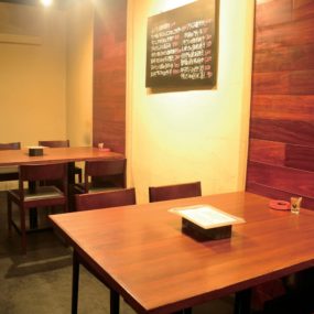 オープンカウンターから供される、主に地の食材を使った美味の数々にファンも多い名店。写真の肉料理の他、寒い季節にぴったりの「トリッパのトマト煮込み(850円+税)」や「鮮魚の鉄板焼(1,200円+税」もイチオシだとか。満席になることもしばしばなので、ご予約しての来店がおすすめ。