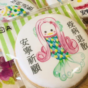 疫病退散・安寧祈願を願い作ったプリントクッキー。アマビエとは「病がはやったら私の写し絵を人々に見せよ」といい残し海へ消えたとされる妖怪。プリントされたアマビエを皆様で広げコロナの早期終息、疫病退散・安寧祈願を願います。