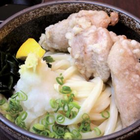 自慢のうどんはコシの強いモチモチ感のある中太麺で、昆布とイリコの風味が効いた出汁と相性抜群。出来立ての美味しさが堪能できる入魂の一杯に早くも魅了されるファンも多数。また、宮崎県産地鶏を使用した鶏の天ぷらは滋味あふれる美味しさで、存在感のあるうどんにもピッタリ。揚げたて出来たての美味しさをぜひ堪能してみて。