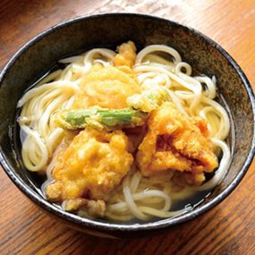 ボリューム満点のとり天ざる&いか天ざるに衝撃を受ける、正に”噂”のお店。見た目のインパクトだけでなく、イリコとカツオの風味が強いダシをまとわせた麺を口へ運べば、至福のひと時が訪れるはず。カラッと2度揚げで下味のしっかりついた天ぷらもダシにくぐらせて味わってみよう。