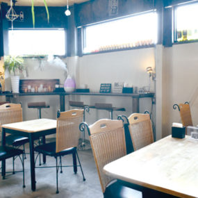 『Garage Bar OCEAN’S 11』の昼の部としてOPENした『さちかふぇ』。店内は、Bar特有の落ち着いた雰囲気でおしゃれな空間が広がる。1番人気の「さちランチ(1,000円+税)」は旬の素材や発酵食品を中心に使用し、店主のおまかせで毎日入れ替わるそう。また、1品1品全て手作りの小鉢は、種類豊富でバランス良く食事を摂ることができる。ドリンクも充実しているので、ゆっくりとした時間を過ごしては。