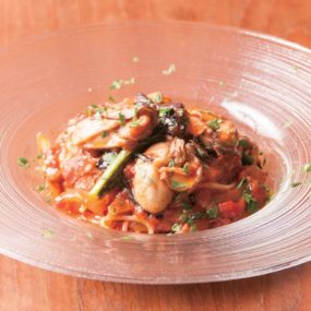 【志度湾からの牡蠣のトマトソーススパゲッティ(ディナーコース3,000円+税~の一例)】