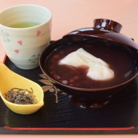 冬季限定メニュー。絶妙な焼き加減の焼餅が入ったあっさりとしたぜんざい。+200円でドリンクセットの追加も可能!